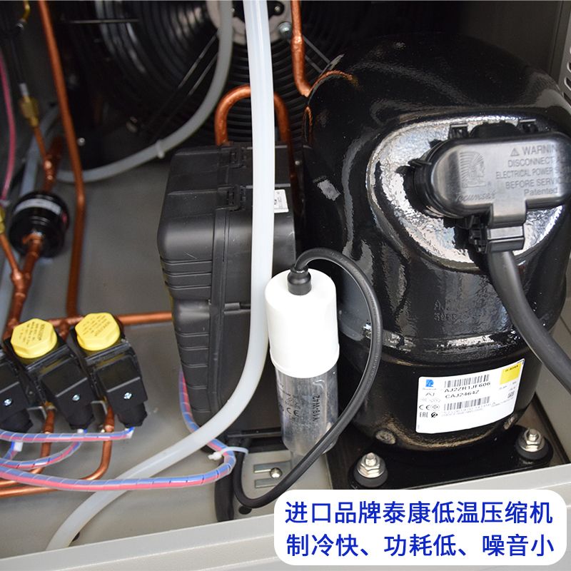1、采用法国(全封闭式泰康压缩机)、干燥过滤器、冷媒流量视窗、修理阀、油分离器、电磁阀、贮液筒均采用进口原装件。